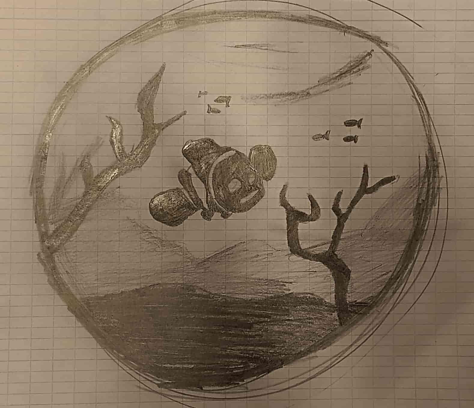 Ensuite, j’ai commencé un croquis pour un des hublots. Je devrai continuer plus tard le travail sur Illustrator. Le but, c’est de créer plusieurs couches et entre les couches, on met de la lumières grâce à des bandes Led. C’est un des profs de 3D qui nous a donné cette idée. Il nous a montré quelques projets sympas qui sont nos références.
